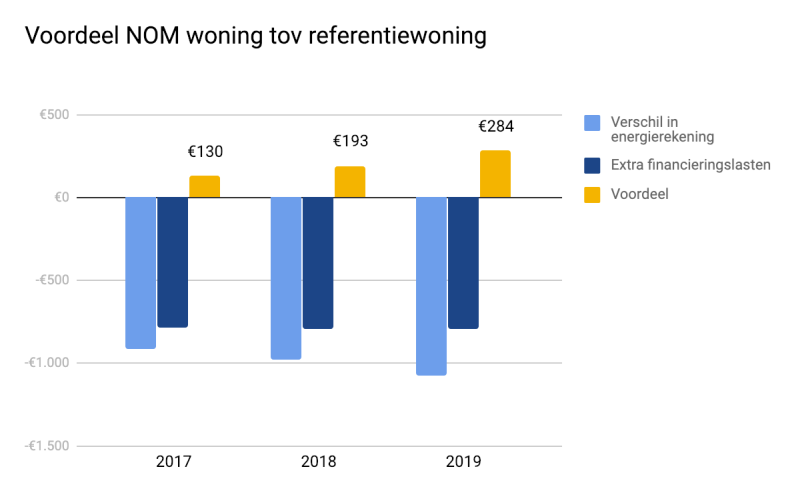 Door de oplopende kosten van energie loopt het verschil in energielasten tussen een nul-op-de-meter woning en een gangbare referentiewoning** op tot ongeveer € 1.080,- per jaar. De financieringslast van bijbehorende meerkosten om tot nul-op-de-meter te komen is € 795,- per jaar. Het voordeel bedraagt dan netto € 284,- per jaar in 2019. In 2017 was dit nog € 130,-.
